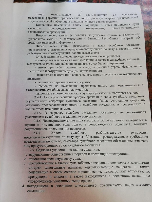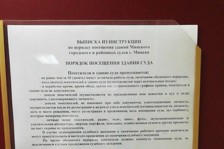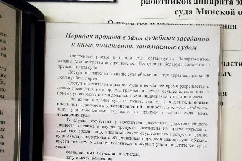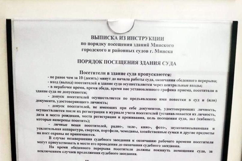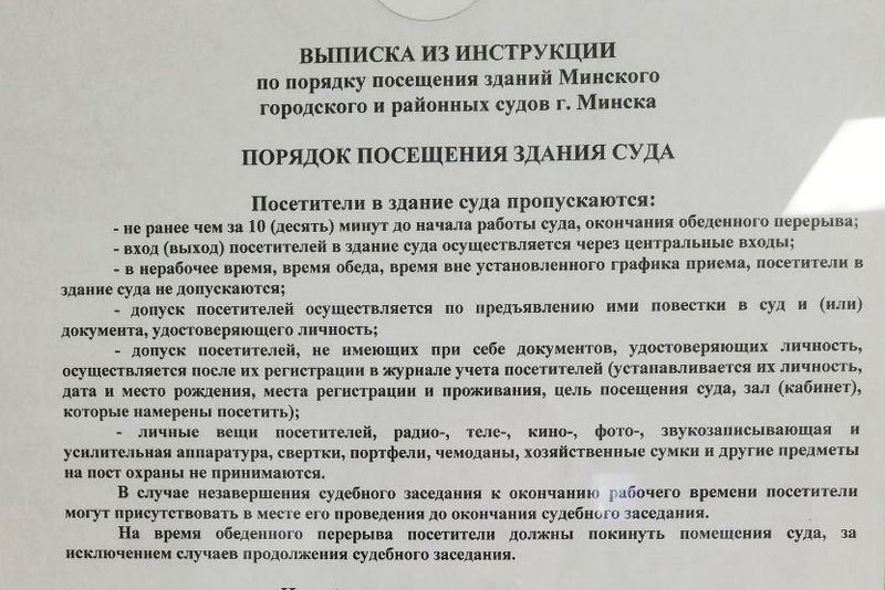 В судах Заводского, Фрунзенского, Центрального районов Минска и Минском городском суде на стендах размещена только выписка из Инструкции, однако пункты о порядке посещения представителями СМИ зданий судов в них не включены.