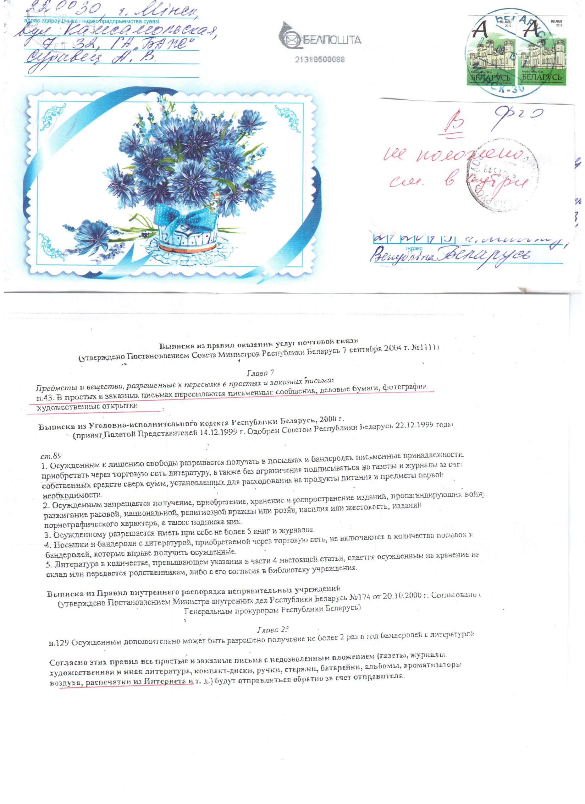 - Во-первых, Васьковичу посылали не “бандероль с литературой”, а простое письмо. Поэтому непонятна ссылка на на п. 129 “правил внутреннего распорядка…” Цитируя главу 7 “Правил оказания услуг почтовой связи”, где перечисляются разрешенные для пересылки вещи, неизвестный цензор вольно оборвал цитату. П. 43 не заканчивается словами “художественные открытки”, а имеет продолжение: “печатные рекламно-информационные материалы, схемы и другое”.