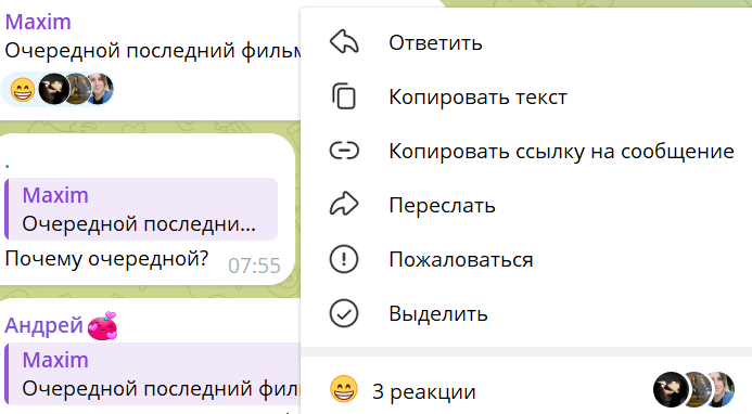 Но заходим в комментарии под этой новостью и обнаруживаем, что можно просмотреть профили пользователей, которые поставили эмодзи под сообщением другого юзера. Для этого надо кликнуть на сообщение в приложении мессенджера на телефоне или на правую кнопку мыши в ПК-версии.