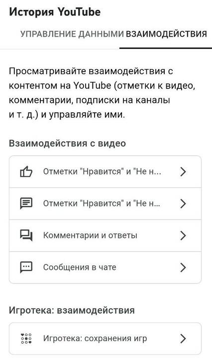 Сначала нажимаем значок профиля — «Управление аккаунтом Google» — «Данные и конфиденциальность» — «История поиска и просмотра YouTube» — «Управление историей» — «Взаимодействие».