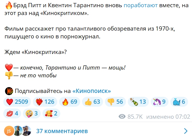 Для примера возьмем телеграм-канал российского «Кинопоиска». Лайки и другие эмодзи под новостью о новом фильме Квентина Тарантино анонимны.