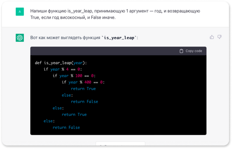 ChatGPT справится с несложной функцией (часть кода, которую, как правило, называют неким именем и к которой потом обращаются из другого места программы), поможет переписать неверные части кода или оптимизировать его. Нейросеть не заменит опытного программиста. Как минимум кому-то нужно давать команды и следить за результатами, чтобы не было ошибок. Зато ей можно делегировать рутинные задачи, чтобы ускорить работу.