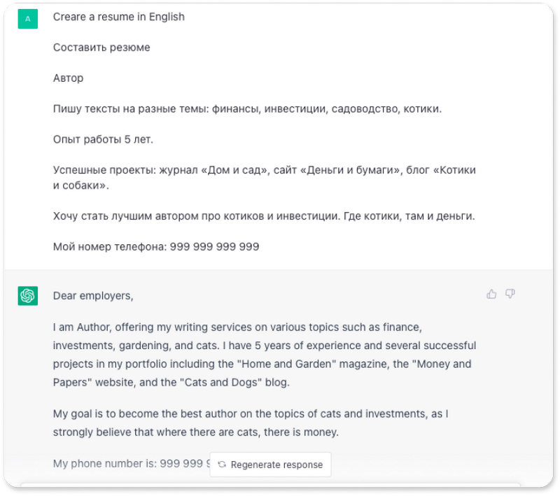 ChatGPT не заменит и профессионального переводчика, но быстро сделает перевод или текст, например, на английском языке, если вы дадите задание по-русски.